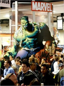 The Incredible Hulk and Iron Man, two of Marvel Comics’ stable of characters, loom over attendees at the Comic-Con 2008 convention in San Diego.